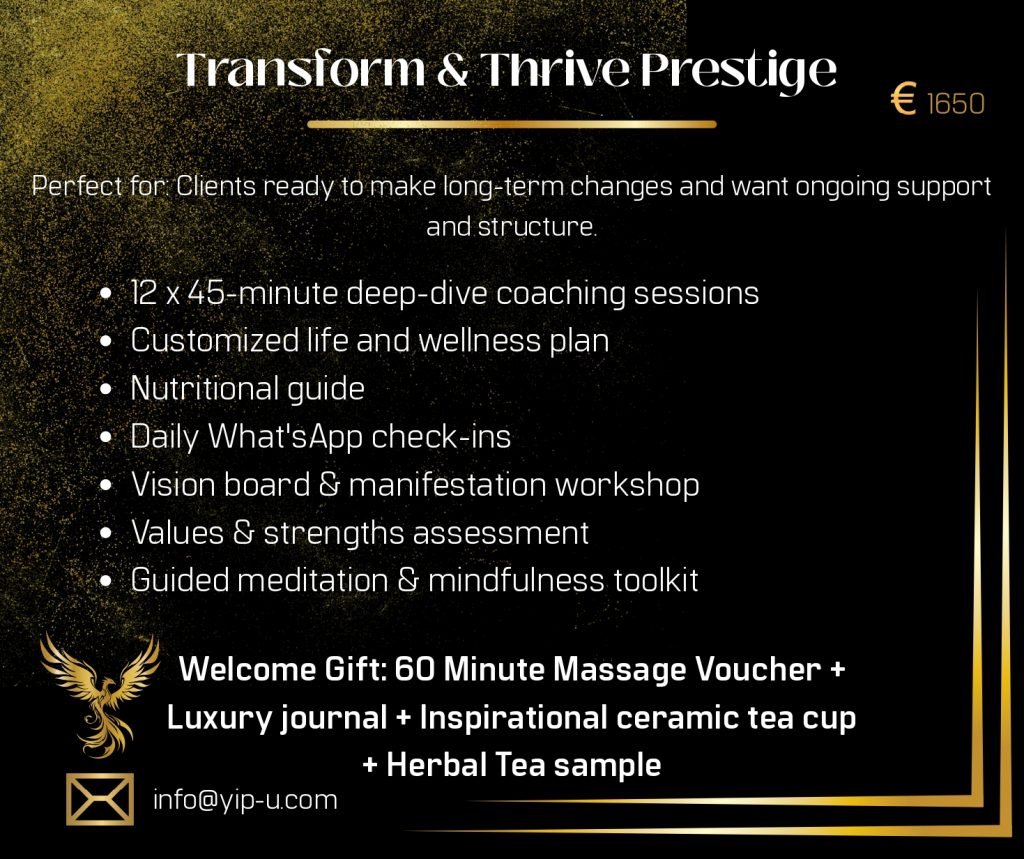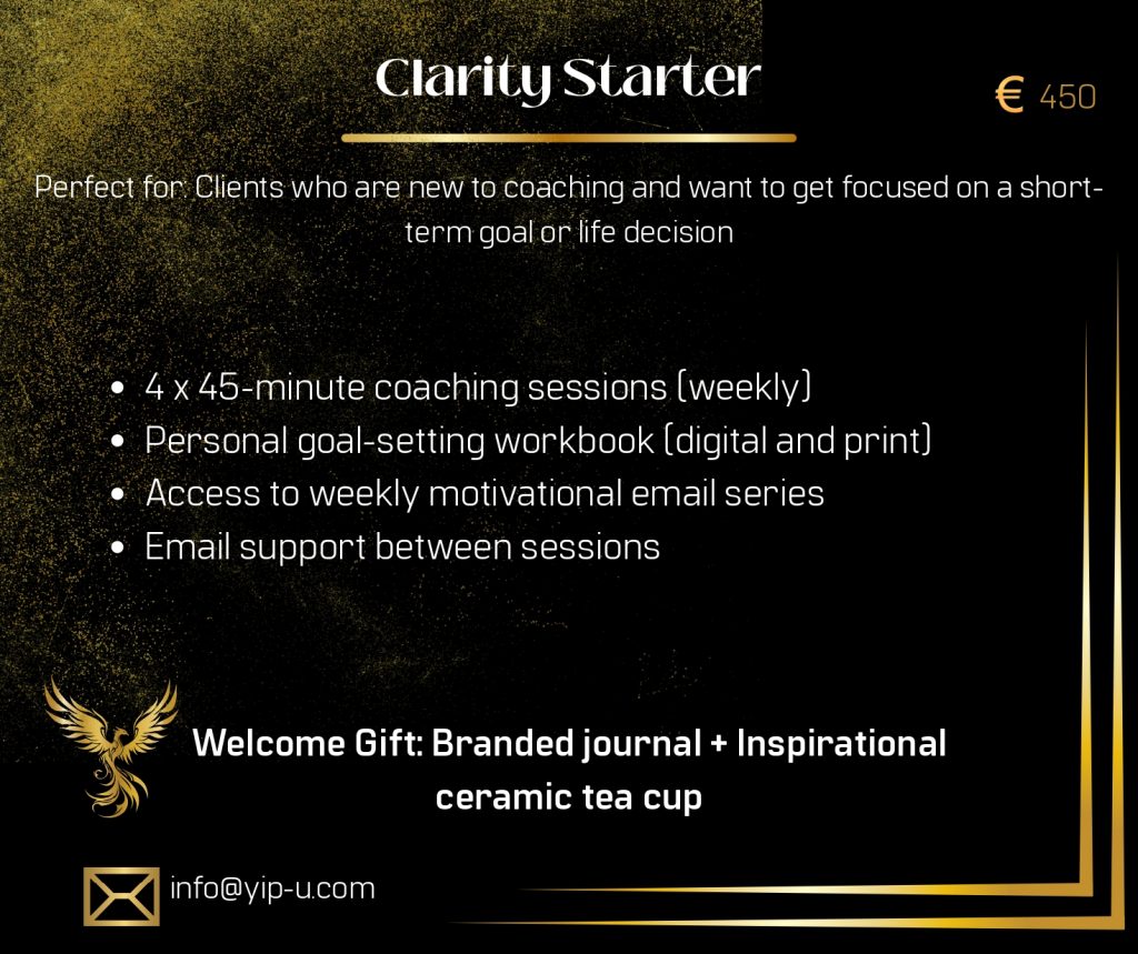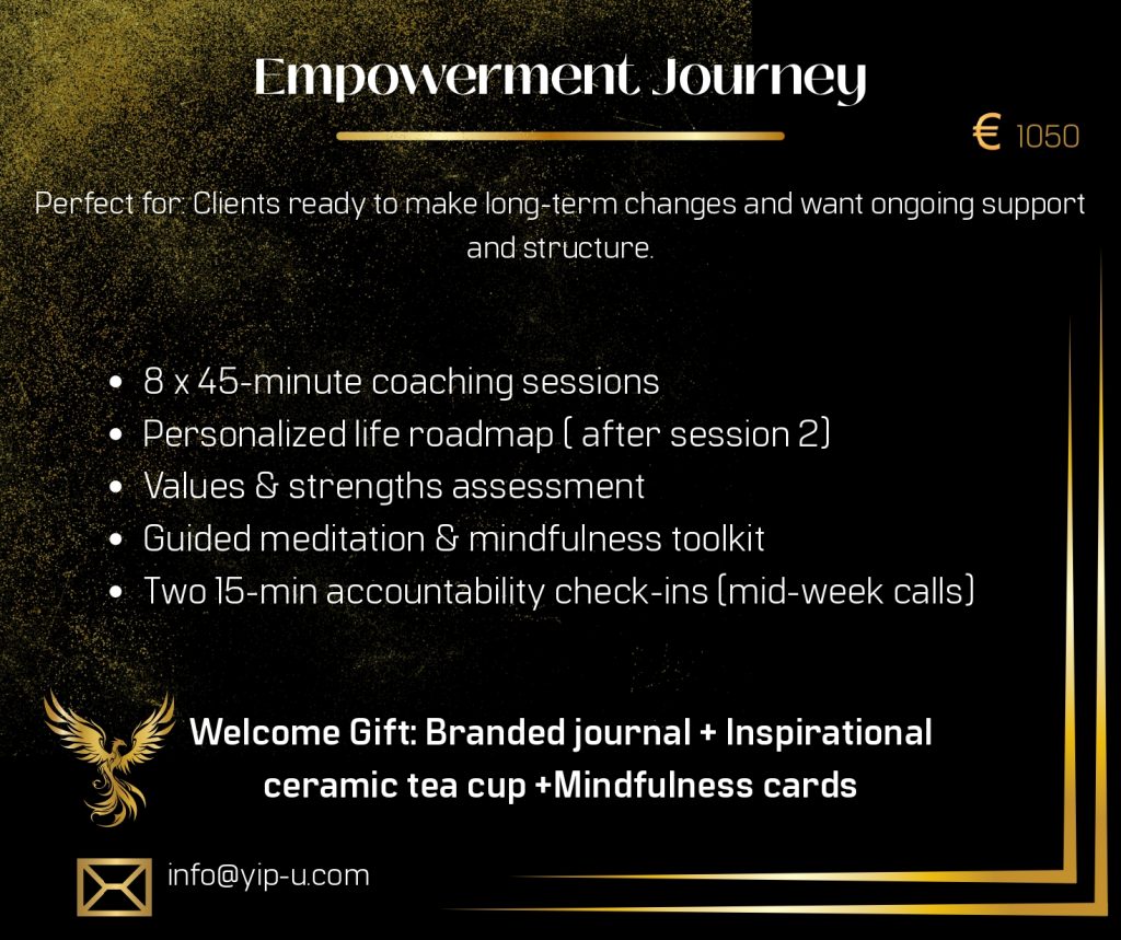 At YIP-U, we offer three transformative coaching packages designed to meet you at every stage of your journey — the Clarity Starter to help you gain focus and direction, the Empowerment Journey to guide you through growth and lasting transformation, and the Transform & Thrive Prestige for those ready to elevate their mindset and life to the highest level.
